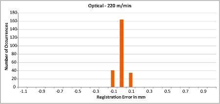 Les tableaux ci-dessous montrent l'emplacement (le repérage) de 240 étiquettes consécutives détectées par différents capteurs. Une seule barre au centre de chaque graphique indique que les 240 étiquettes ont été placées avec une précision de ± 0,05 mm. D'autres barres indiquent combien d'étiquettes ont été placées différemment (selon la hauteur de la barre) et dans quelle mesure elles ont varié (à quelle distance les barres se trouvent du centre du graphique).